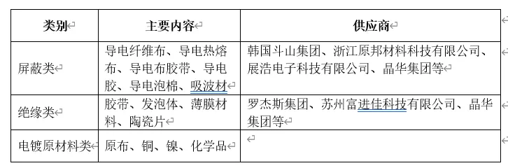电磁屏蔽材料包括导电泡棉、导电布、导电布胶带等,主要应用于笔记本电脑的相机模块、显示器组件、主板部件及硬盘等部件,以及平板电脑的玻璃触摸面板组件、主板部件、天线组件等部件,通过对电磁波的反射和吸收,对电磁干扰进行屏蔽,阻断电磁波的传播路径,实现电子设备和元器件的电磁兼容。