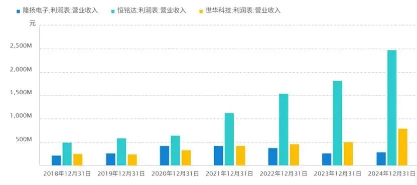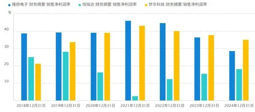 以下对比了隆扬电子、恒铭达、世华科技的业绩表现,从营收上看,隆扬电子成长性较弱,世华科技2021年之前营收规模与其较为接近,但此后已逐步甩开隆扬电子一大截,而恒铭达复合增长动能最强;从销售净利率上看,隆扬电子和世华科技都很突出,2022年之后均逐年回落,但世华科技韧性更强,叠加营收规模持续扩大,世华科技的净利润已数倍于隆扬电子。恒铭达销售净利率虽不及前两位,但2022年至今持续攀升,规模效应显著。
