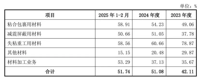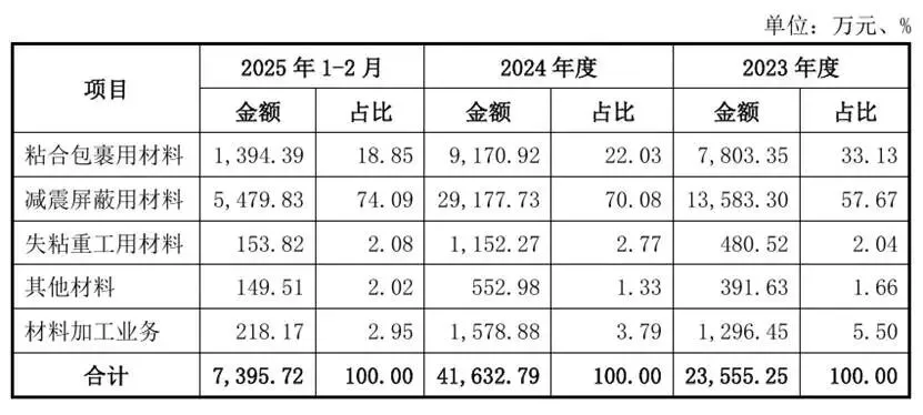 (1)减震屏蔽用材料为德佑新材核心产品,系2024年业绩增长最显著的产品类别,具有防水防尘、缓震、抗冲击、电磁屏蔽等性能,主要适用于手机、电脑、家电组件的缓冲固定以及电磁感应和辐射的屏蔽。根据基材性质和胶粘剂不同,可分为聚丙烯酸泡棉单双面胶带、聚氨酯泡棉双面胶带、聚乙烯泡棉双面胶带、金属箔类胶带等。2024年度起,德佑新材研发量产的新产品聚丙烯酸泡棉胶带大批量用于显示屏的抗冲击、抗印痕、手机视窗和后盖固定,因其技术领先,迅速抢占了市场份额,对京东方、天马、华星、维信诺等几大屏厂均有供应,且议价能力较强,销售价格较高。