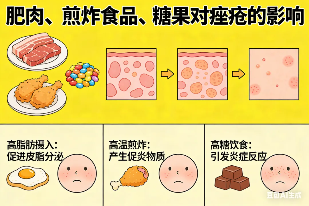 高热量、高刺激性、高糖量的食物,如肥肉、煎炸食品、巧克力、糖果等,这些食物摄入超过人体的代谢能力时,就会引起毛孔堵塞,形成痤疮。月经与痤疮