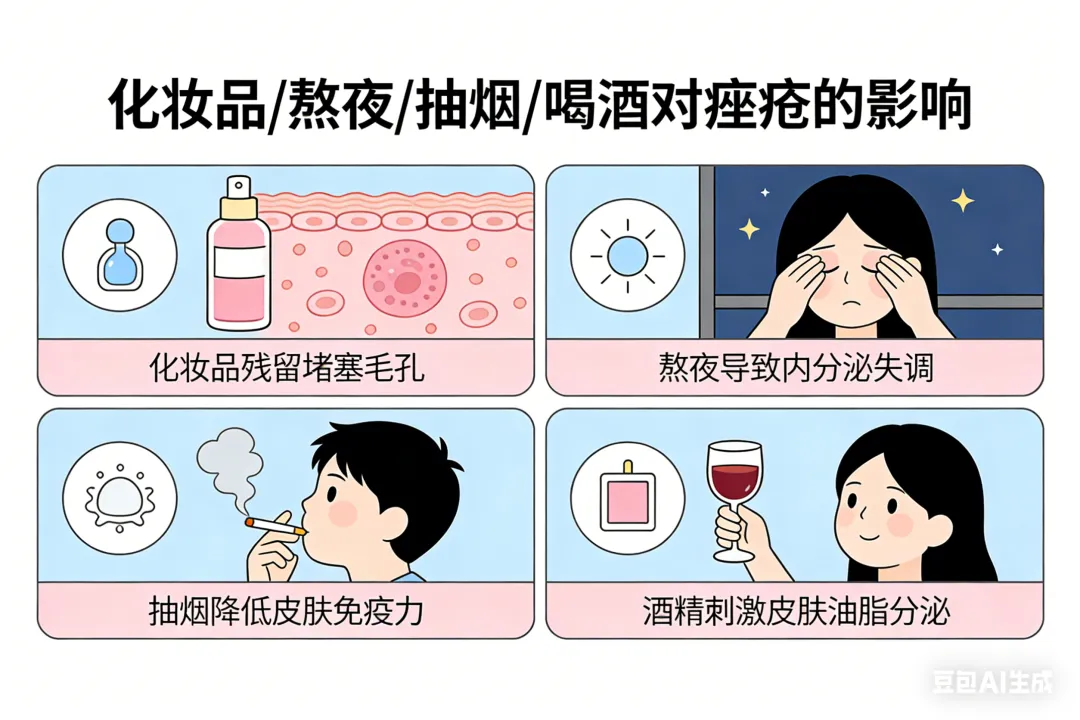 一部分人熬夜后就会出现痤疮,或原有的痤疮加重,简单的说,就是熬夜 → 雄激素升高 → 爆痘更凶。对女性而言,熬夜还会导致雌激素、孕激素分泌紊乱→排卵更不正常→月经推迟、不来、量少→经期前爆痘变得更猛、更频繁。总而言之:不规律作息可使生物钟紊乱,表现为内分泌系统、免疫系统的紊乱,从而导致痤疮的发生。长此以往,人体免疫力低下,疲劳、便秘、头痛、失眠等症状都会出现,这又会加重痤疮的病情。药物与痤疮