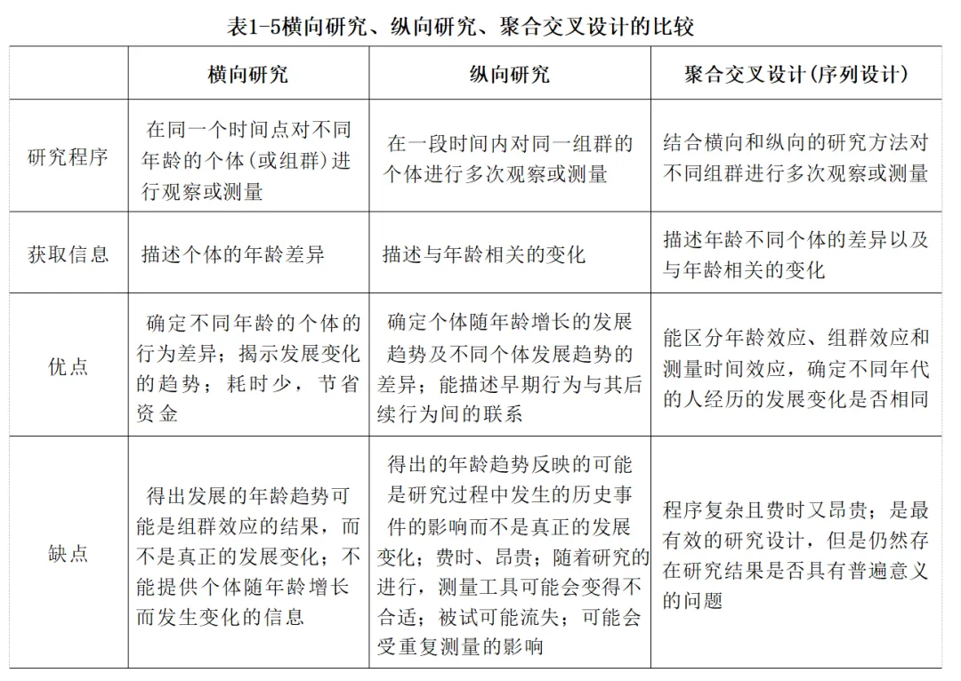 为了避免横向研究和纵向研究设计上的局限性,研究者把横向研究与纵向研究结合起 来形成了聚合交叉设计,又称序列设计。前面提到的对性别角色的态度 的发展趋势研究的聚合交叉设计,既要有像横向设计那样比较不同年龄群体(如30岁、50 岁、70岁)的态度差异;又要有像纵向设计那样的对各年龄被试的态度进行多次定期(如每隔 5年)的评定。这样的设计研究能够区分年龄效应、组群效应和测量时间效应,能够确定哪些年龄趋势是真正的发展趋势。但是聚合交叉设计十分复杂,花费也很昂贵,有时也不一定 得出明确的结论。