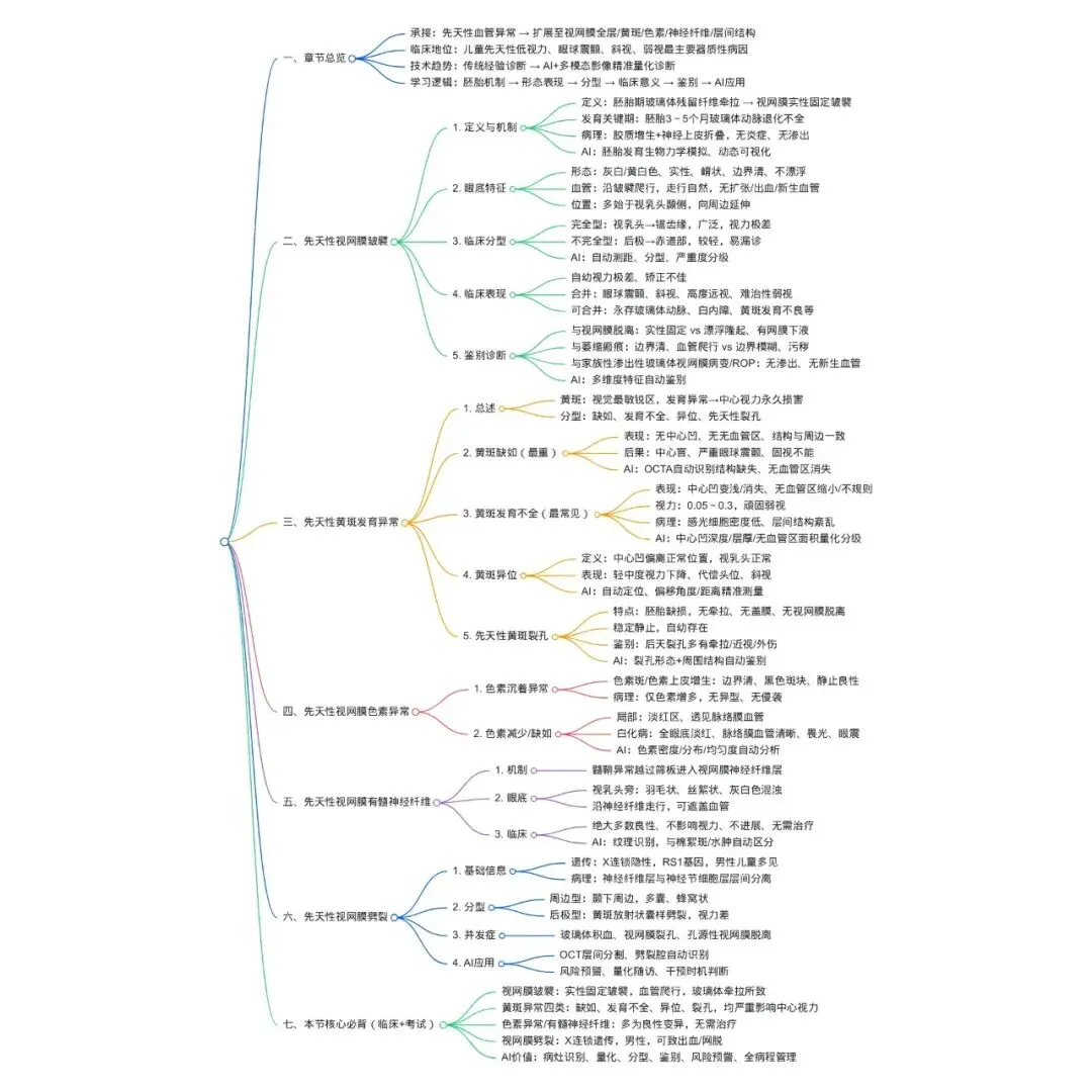 6.人工智能在先天性视网膜与黄斑疾病中实现:微小病灶识别、结构量化、自动分型、鉴别诊断、风险预警、预后预测、全周期管理。