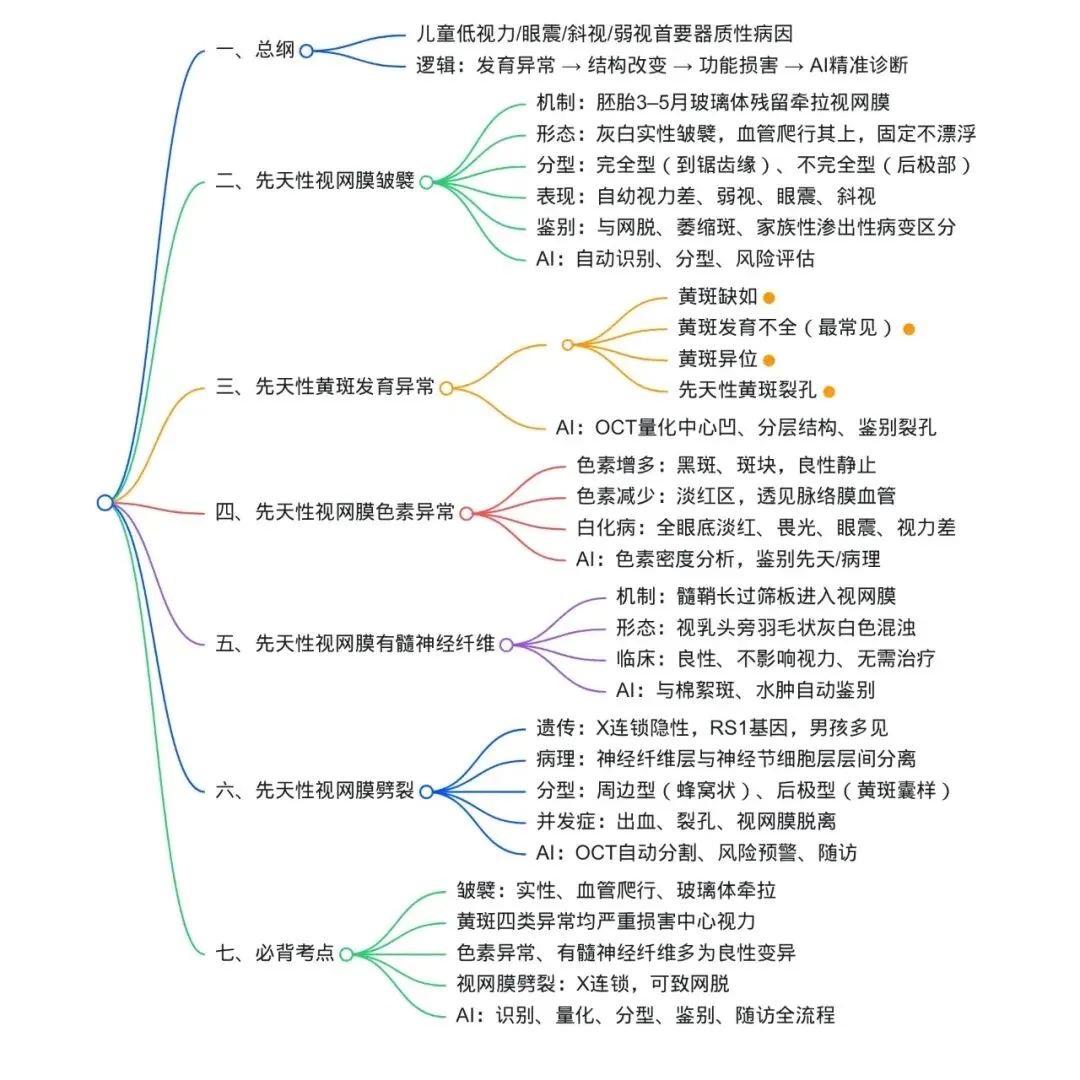 5.先天性视网膜劈裂为性连锁隐性遗传,多见于男性儿童,以神经纤维层层间分离为特征,可发生出血与视网膜脱离,需长期AI量化随访。