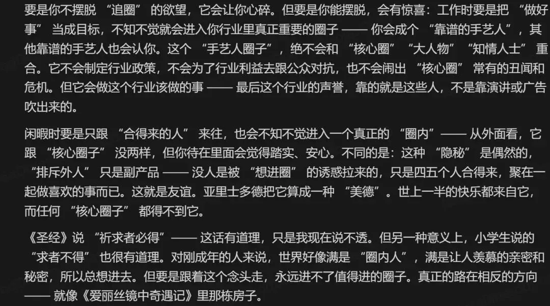 A2:在第1篇文章隐秘的圈子里说到想要融入一个圈子有欲望它很危险,可能会让一个本来不坏的人变成坏人。也说到在这种任何“核心圈子”几乎不会有真正的友谊。