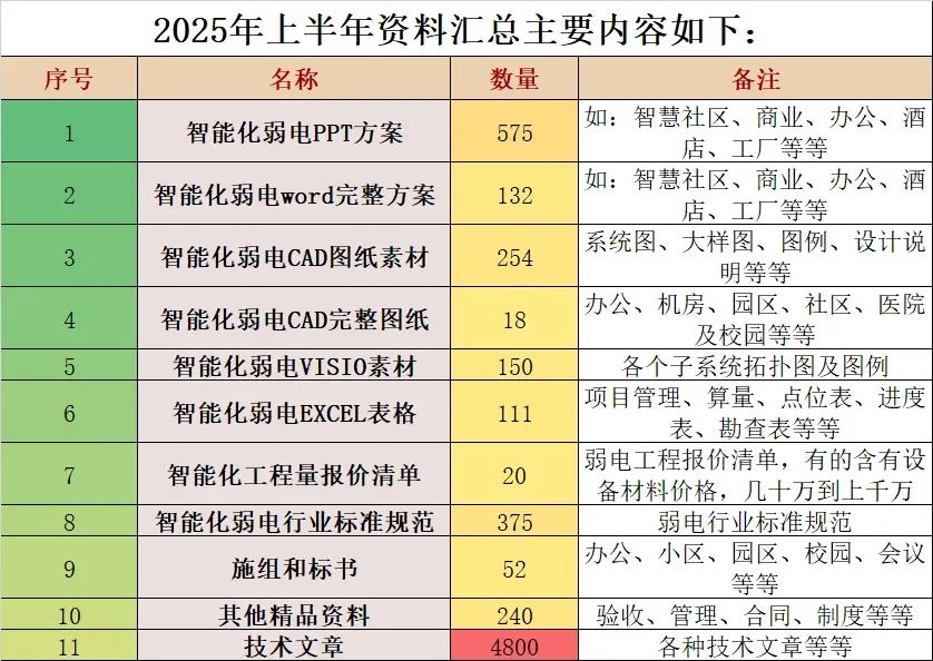 最近发布了2025年上半年(到6月30号)的公众号文章。里面有方案,有图片,基本涵盖了智能化弱电行业的各个系统的文章,而且还送22套精品资料,每一篇都带着题目,方便大家查找相关内容。比如搜索视频监控方面的资料。此资料非常适合新人学习,尤其没有时间、又不知道怎么搜索资料的,全文件共计6700多个,建议弄一套,绝对有帮助!