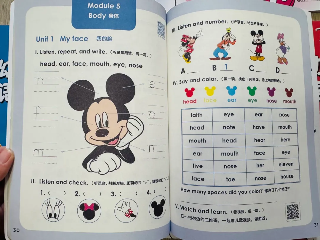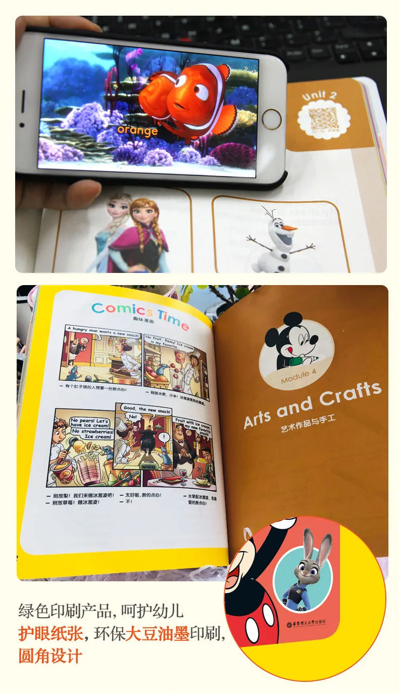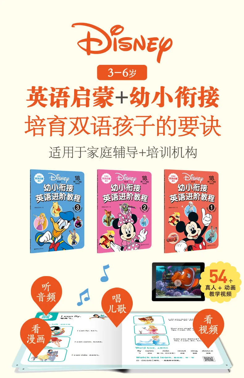 ✅ 包含18大学习主题,36组情景对话,54个教学视频,300个高频词汇和大量孩子们喜闻乐见的迪士尼形象,趣味十足,方法有效,可以全面激发幼儿英语学习潜能。