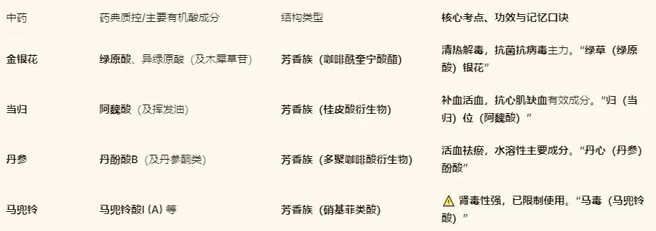 每味中药绑定其核心有机酸成分(金银花-绿原酸,当归-阿魏酸,丹参-丹酚酸B,马兜铃-马兜铃酸)。