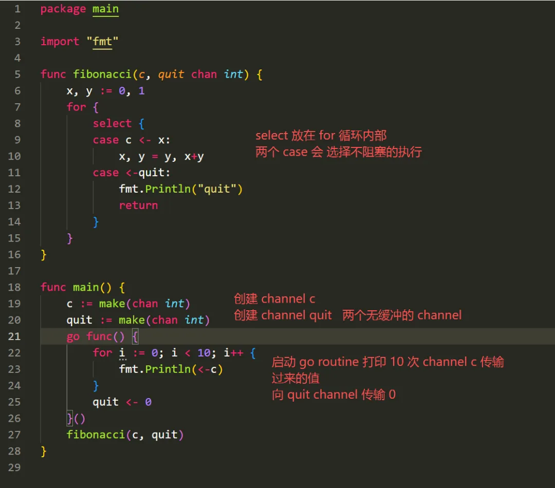 我们在 select中的一个分支中向 c发送数据,另个分支从 quitchannel 中接收数据, 让fibonacci函数可以同时处理多个 channel