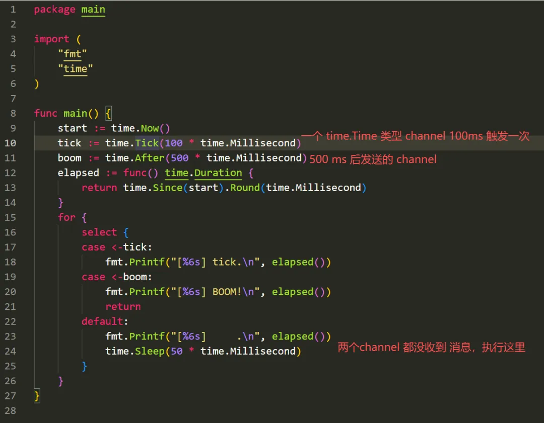 这里使用了两个go 内部的只读 channel 分别是 tick 和boom防止你向 tick 和 boom 中写数据,他们是只读的。再把他们放的 for 包围的 select 语句中,就可以让你的代码以固定的周期来运行了, 如果在一次 select 中 两个case 都没有数据发送过来,会执行 default 子句二叉树小练习