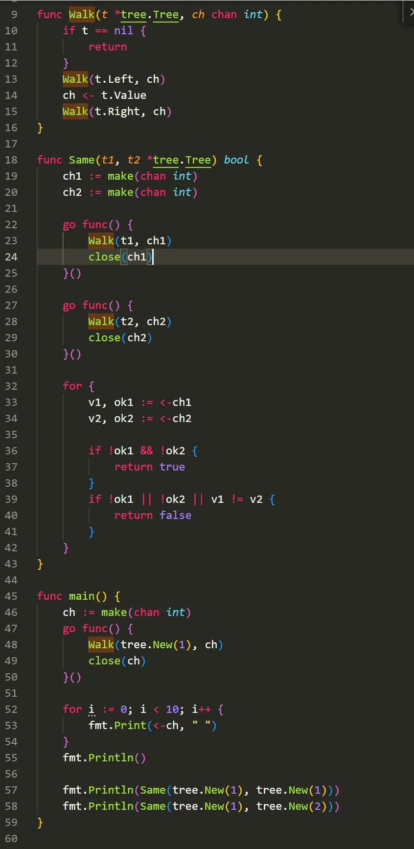 题目要求实现 Walk 和 Same 两个函数,一个实现二叉树的遍历 一个实现对比 Same 如果两棵树相同就返回 true