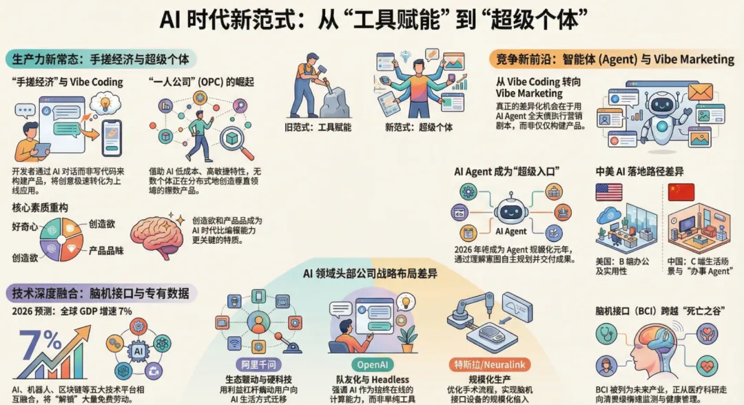 读完最大的感受是:2026年,我们可能真的站在了一个从“技术爆发”到“应用深水区”的转折点上。模型能力不再是唯一的焦点,“如何用”、“谁来用”以及“用在哪”,正在成为新的胜负手。