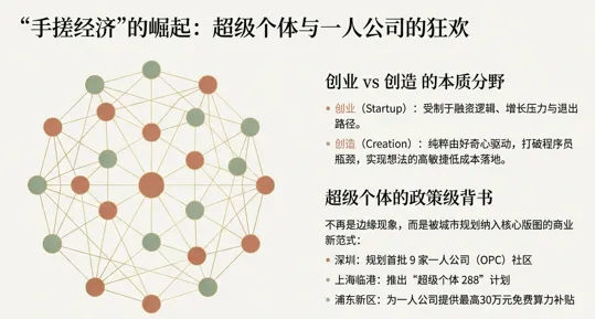 “手搓经济”的特点是:分布式、低成本、高敏捷。一个想法从脑子到上线,可能就是一个周末的事。深圳、上海、杭州等地已经开始规划“一人公司opc”社区,提供算力支持。