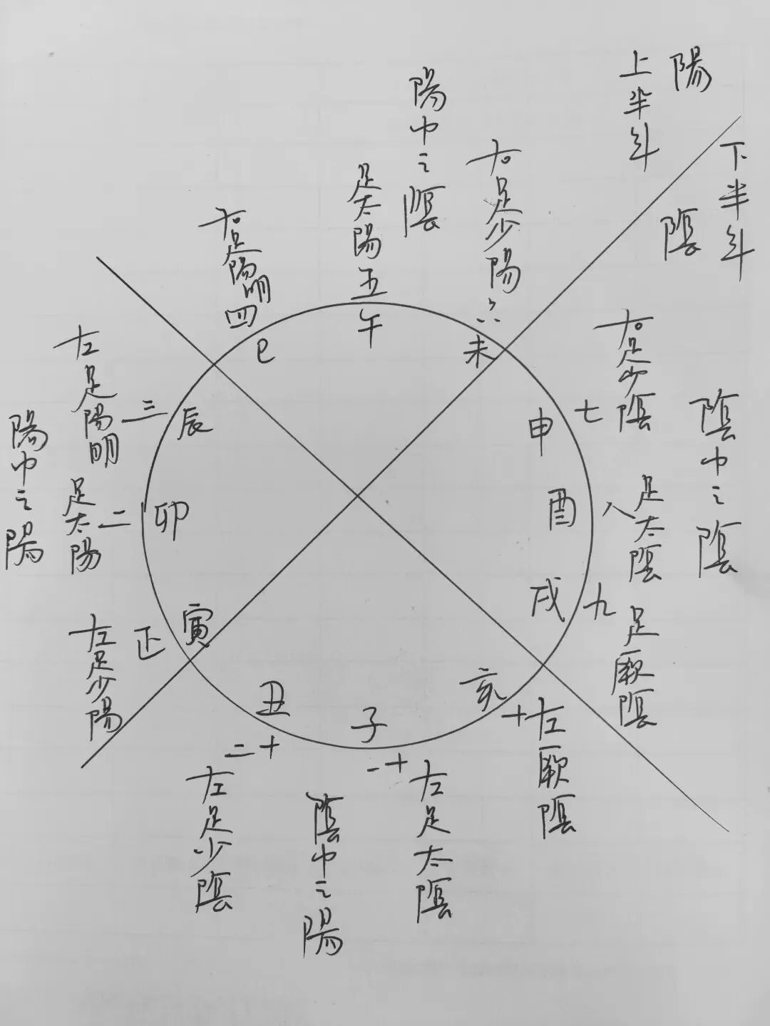 岐伯曰:寅者,正月之生阳也,主左足之少阳。未者,六月,主右足之少阳。卯者,二月,主左足之太阳。午者,五月,主右足之太阳。辰者,三月,主左足之阳明。巳者,四月,主右足之阳明。此两阳合于前,故曰阳明。申者,七月之生阴也,主右足之少阴。丑者,十二月,主左足之少阴。酉者,八月,主右足之太阴。子者,十一月,主左足之太阴。戌者,九月,主右足之厥阴。亥者,十月,主左足之厥阴。此两阴交尽,故曰厥阳。(十二月应十二地支,寅为正月,卯为二月,辰为三月,巳为四月,午为五月,未为六月,申为七月,酉为八月,戌为九月,亥为十月,子为十一月,丑为十二月。一年有十二月,上半年为阳,下半年为阴,人有两足,左足为阳,右足为阴。上半年正二三月为阳中之阳,四五六月为阳中之阴,下半年七八九月为阴中之阴,十十一十二月为阴中之阳。合于双足,正月应左足少阳,二月为左足太阳,三月为左足阳明,四月为右足阳明,五月为右足太阳,六月为右足少阳。七月为右足少阴,八月为右足太阴,九月为右足厥阴。十月为左足厥阴,十一月为左左足太阴,十二月为左足少阴。)