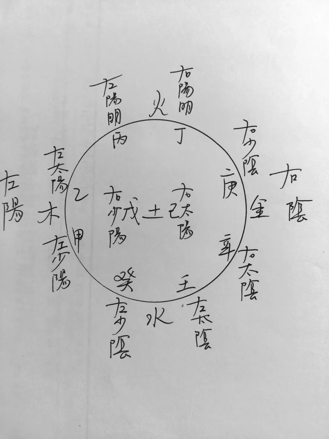甲主左手之少阳,己主右手之少阳。乙主左手之太阳,戊主右手之太阳。丙主左手之阳明,丁主右手之阳明。此两火并合,故为阳明。庚主右手之少阴,癸主左手之少阴。辛主右手之太阴,壬主左手之太阴。(前言十二地支为阴,应足经,应十二月。此处介绍十天干为阳,应手经,应十日。东方甲乙木,南方丙丁火,西方庚辛金,北方壬癸水,中央戊己土。东升西落,左升右降,东南中属阳,西北属阴,所以甲为左手少阳,乙为左太阳,丙为左阳明,戊为右少阳,己为右太阳,丁为右阳明,庚为右少阴,辛为右太阴,壬为左太阴,癸为左少阴。) 故足之阳者,阴中之少阳也,足之阴者,阴中之太阴也。手之阳者,阳中之太阳也;手之阴者,阳中之少阴也。腰以上者为阳,腰以下者为阴。(手足分阴阳,手为阳,足为阴,手中之阳为阳中之太阳,手中之阴为阳中之少阴,足中之阴为阴中之太阴,足中之阳为阴中之少阳。) 其于五脏也,心为阳中之太阳,肺为阳中之少阴,肝为阴中少阳,脾为阴中之至阴,肾为阴中之太阴。(阴阳象数变化,象变数亦变,膈上为阳,膈下为阴,阴阳之中亦分阴阳。) 岐伯曰:正月二月三月,人气在左,无刺左足之阳;四月五月六月,人气在右,无刺右足之阳;七月八月九月,人气在右,无刺右足之阴,十月十一月十二月,人气在左,无刺左足之阴。(根据人气所在提出针刺禁忌。) 黄帝曰:五行以东方为甲乙木,王春。春者,苍色,主肝,肝者,足厥阴也。今乃以甲为左手之少阳,不合于数,何也? 岐伯曰:此天地之阴阳也,非四时五行之以次行也。且夫阴阳者,有名而无形,故数之可十,离之可百,散之可千,推之可万,此之谓也。(指出象数精神,象数属于不同层次的一个太极,象是一个太极,数也是一个太极,象中有数,数中有象。天地阴阳之象数不同于四时五行之次行,比如五行之中东方甲乙木,主肝,足厥阴,此篇之中则以甲代表左手之少阳,虽然同名为甲,但意义不同。所以说阴阳者,有名而无形,不以数推,而以象谓之。)