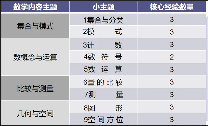 《学前儿童数学学习与发展核心经验》是华师大团队出版的核心经验系列书籍之一,由黄瑾、田方老师主编。本书结合《指南》数学领域目标,从集合与模式、数与运算、比较与测量、几何与空间四大核心经验,详细介绍了儿童数学领域核心经验的发展。本书共十章,第一章为绪论,后九章为核心经验阐释。数学核心经验:儿童在这一年龄发展阶段中可以获得的最基础、最关键的概念和能力。1.基础性。强调最基本、最核心的数学概念,在数学上是居于中心位置且连贯的。如数概念的发展,唱数——手口一致点数——按群数数。2.系统性。强调概念或经验之间的关联和支持。如数概念的经验是儿童理解运算中的数量变化关系的重要前提,而运算的学习与发展也是对数概念的抽象数量关系之比较的认识的反映。3.适宜性。核心经验是基于儿童当下的思维发展水平,建立在幼儿非正式或日常的数学经验基础之上,是适合儿童发展并能促进儿童对基本数学概念的科学理解及逻辑思维的发展。4.前瞻性。核心经验具有极大的预测性,能够为儿童日后的数学学习和逻辑思维发展奠定基础,并促进儿童对数学的持久理解。1.核心经验能帮助教师确立教学的目标与重点,为理解而“教”。2.理解核心经验能使教师的教学更灵活,对儿童数学思维更敏感,对儿童数学学习的支持更有力。1.多元表征——儿童的数学学习是一个从具体到表象再到符号理解的渐进过程。儿童早期数学概念的发展既离不开具体的客观环境和生活经验,又依赖于具体的动作操作和体验,它是儿童在不断积累感性经验,借助于具体事物和想象逐步在头脑中建构起一个抽象逻辑概念的渐进性发展过程。教师在教学中要重视对数学的多元表征,能够用实物情境、教具模型、图形或图表、口语以及书面符号等多种表征的手段来表达数学的概念、解决问题或演示和解释数学的现象,而不仅仅是动手操作。2.情境教学——儿童的数学学习与发展离不开与日常生活情境相联系的学习情景。对儿童来说,数学存在于周围现实生活中,能从真实的生活和游戏中感受事物的数量关系并体验到数学的重要和有趣,对他们而言是一种最自然、轻松而愉快的学习。教师要把儿童的学习置于有意义的、真实的日常生活情境与背景中,如:幼儿园日常生活中的整理玩具、统计到园人数、搭建积木等,都与数学密切有关。3.手脑并用——儿童的数学学习既需要动手操作,也需要数学语言。在幼儿园的早期数学教育启蒙中,让儿童通过充分地操作、体验和建构数的概念是一个重要方面;而鼓励儿童与同伴、教师和其他人交流,用数学的语言进行清楚的、准确的数学方面的表达和交流是另一个更重要的方面。教师应充满运用数学语言(即能体现和隐含一定的数学概念与知识,有助于儿童进行逻辑思考的语言)与幼儿互动,帮助幼儿完善和巩固他们正在形成的数学概念。4.整合数学——儿童的数学学习不是一个单独的、孤立的学习领域。学前数学,是建立在儿童对事物或现象感性体验基础上的一种主动建构式学习,是儿童通过具体的操作或活动引发的思考性学习,是儿童在生活化、情境化、社会化的互动中的经验迁移式学习。学前数学并非孤零零地存在于课堂,而存在于幼儿的一日生活之中——日常环节、户外活动、语言故事、情境表演、建构游戏、美工活动等,数学无处不在。
