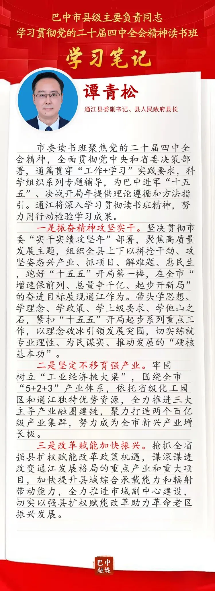 市委读书班聚焦党的二十届四中全会精神,全面贯彻党中央和省委决策部署,通篇贯穿“工作+学习”实践要求,科学组织系列专题辅导,为巴中进军“十五五”、决战开局年提供理论遵循和方法指引。通江将深入学习贯彻读书班精神,努力用行动检验学习成果。