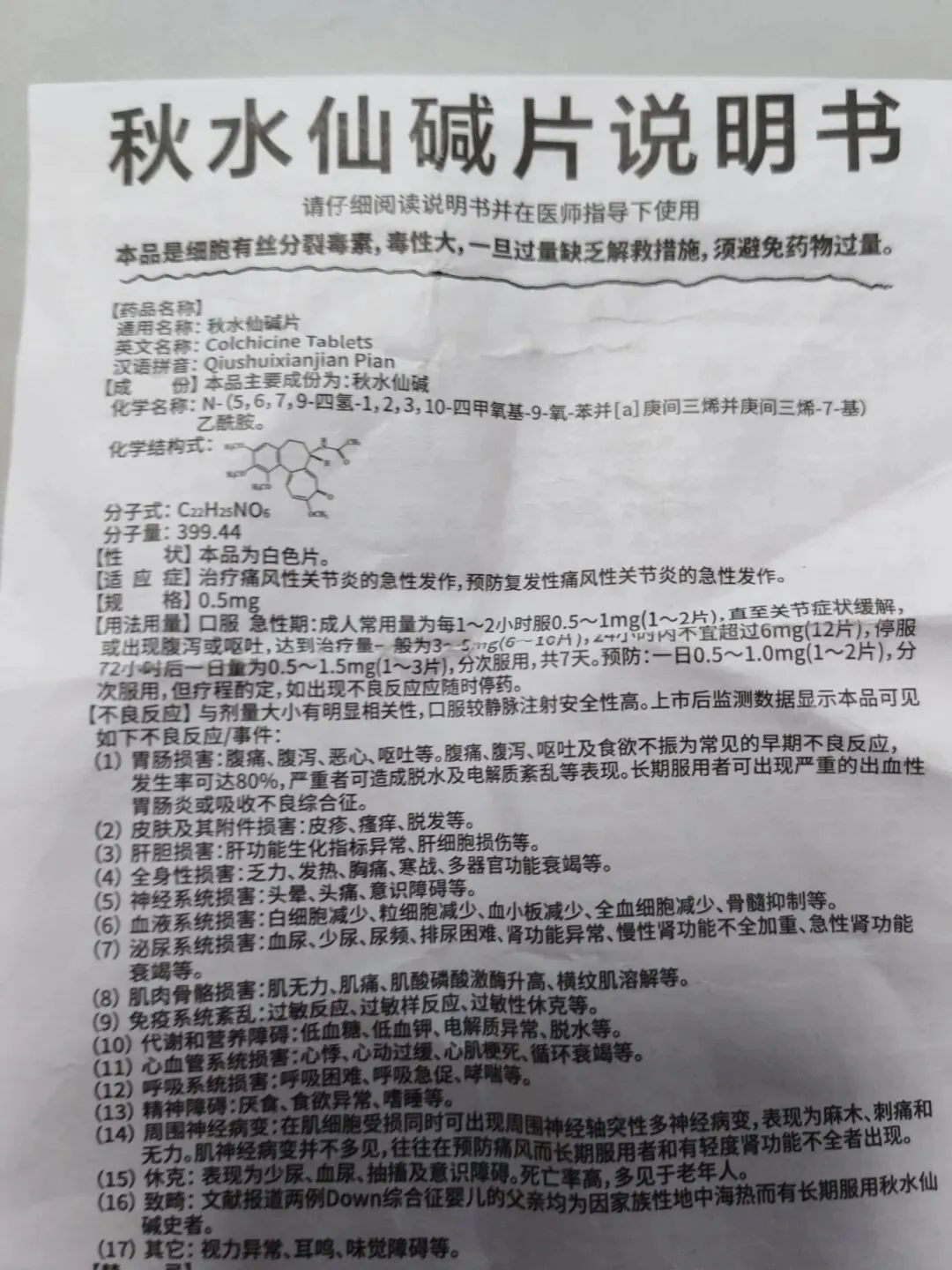 买来药,说明书明确写着,秋水仙碱为细胞有丝分裂毒素,毒性大,且有效治疗量和中毒量接近,关键是一旦过量,缺乏解救措施,所以一定要严格控制剂量。