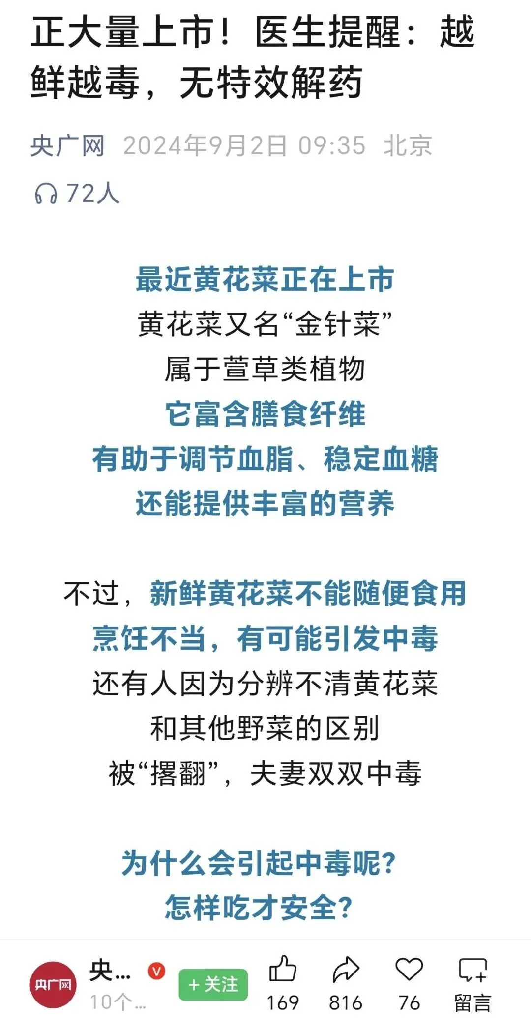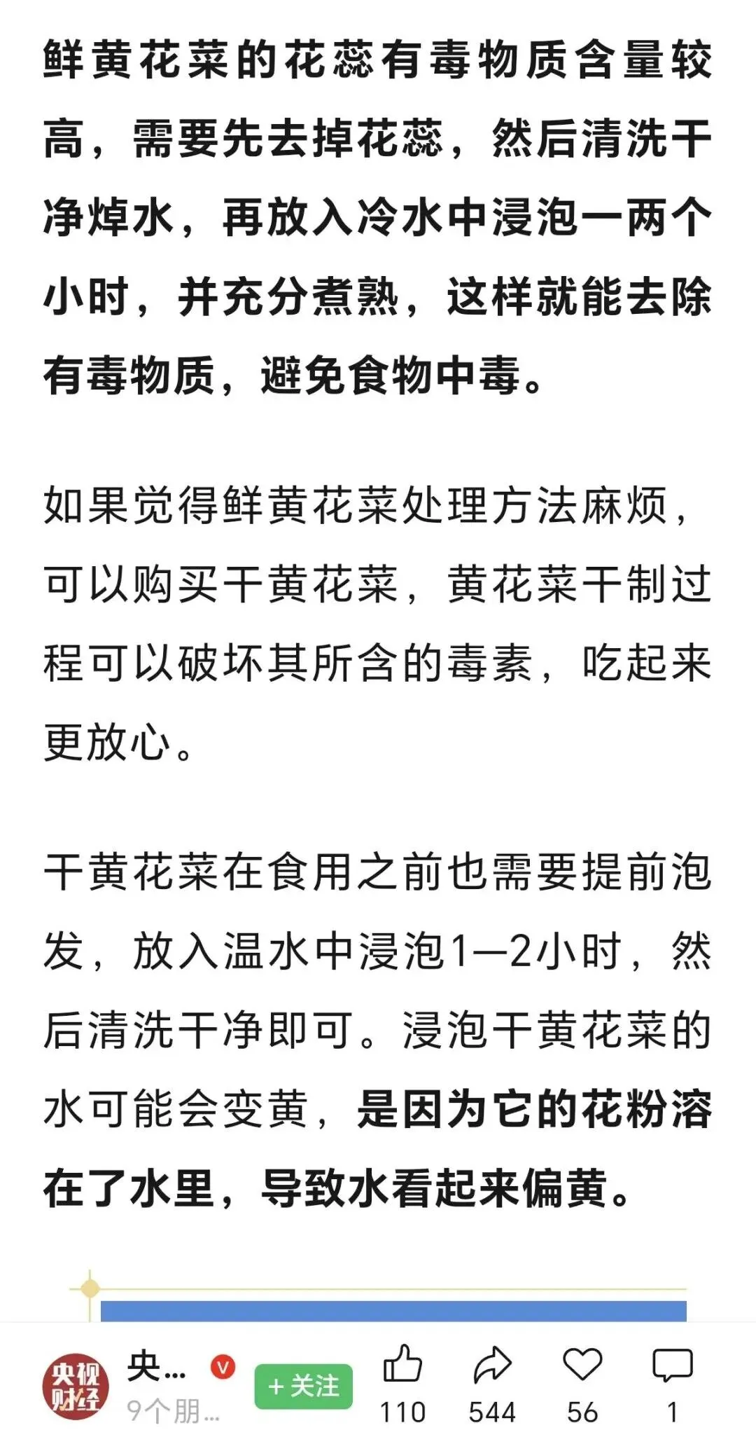 央广财经里提到,鲜黄花菜的花蕊有毒物质含量高。正确处理就可以享用这道美食了。