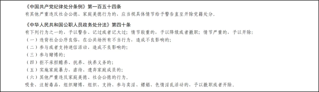 现实中,大多数违反道德规范的行为,可通过社会舆论、教育感化等道德自身的力量来纠正和调整,一部分行为需要党纪、法律来约束。本着纪法分开的原则,对于党员、公职人员实施家庭暴力,已经严重侵害国家和社会利益以及严重侵犯他人权益的,自有国家法律将其作为违法犯罪行为进行处理。对于其中行为轻微危害性较小,虽未构成违法犯罪,但造成不良影响,仅依靠道德力量不能纠正的,则要由党纪予以规范约束。