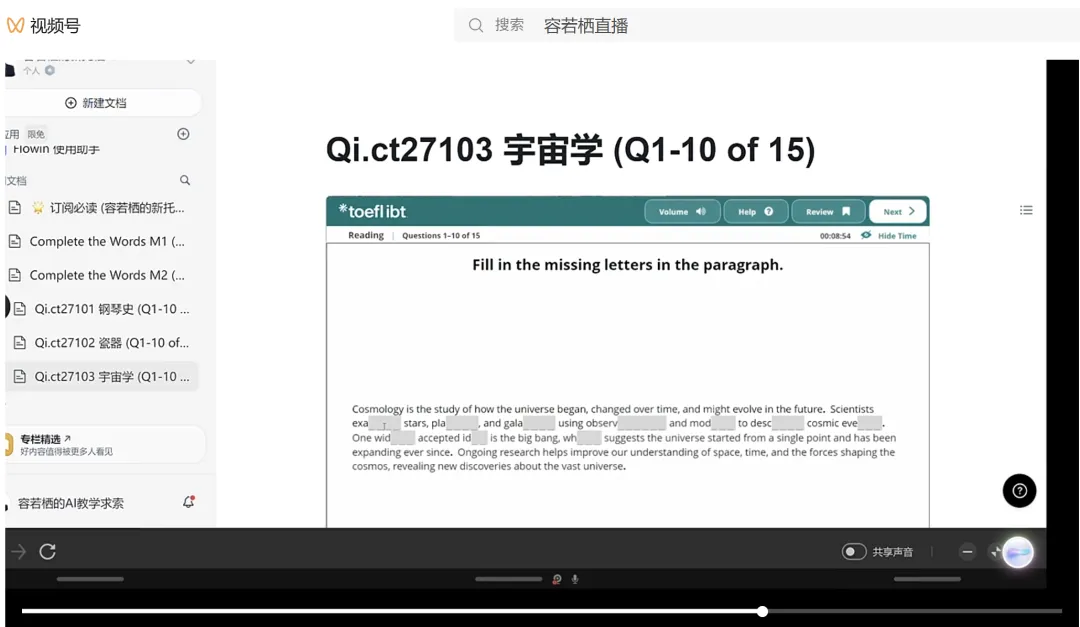 “猫猫,今晚直播的RE(Reading Explorer),你这块比较薄弱!!最好跟着把那些文字记录和逻辑顺畅一下,这可是学术阅读的‘天花板’教材。学一点对你有巨大帮助...”