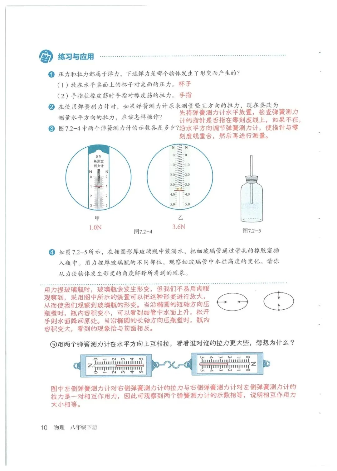 - 所有物体受力都会形变,坚硬物体(桌面、玻璃)会发生微小形变,用“放大法”可观察