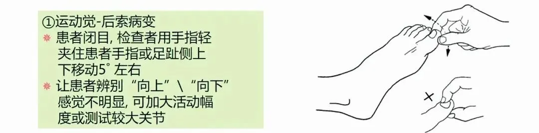 ⑥运动方向/位置觉: 被动活动患者的手指或脚趾,询问其运动方向(向上/向下),或让其指出被触碰的手指,以评估意识性本体感觉。