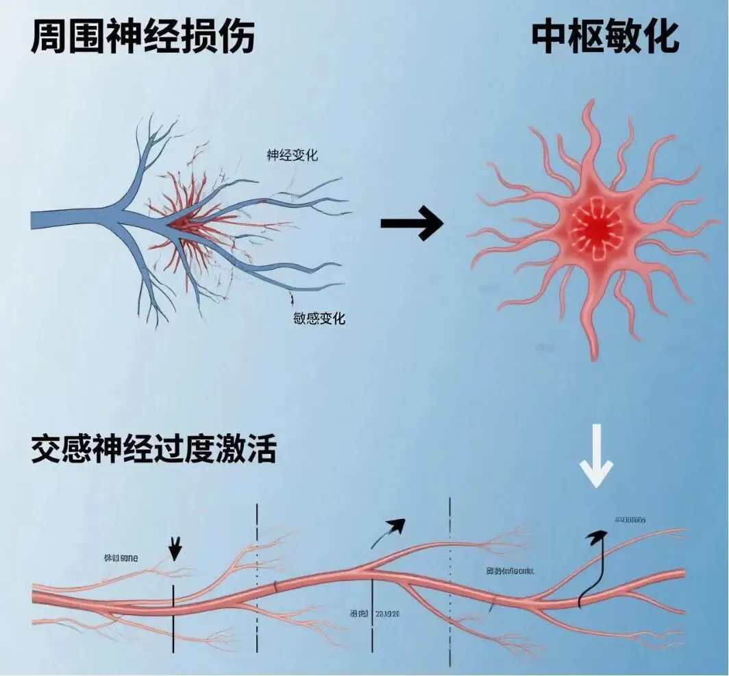 ①周围神经致敏: 以疼痛和感觉异常为主,主要由感觉神经纤维受激惹引起。