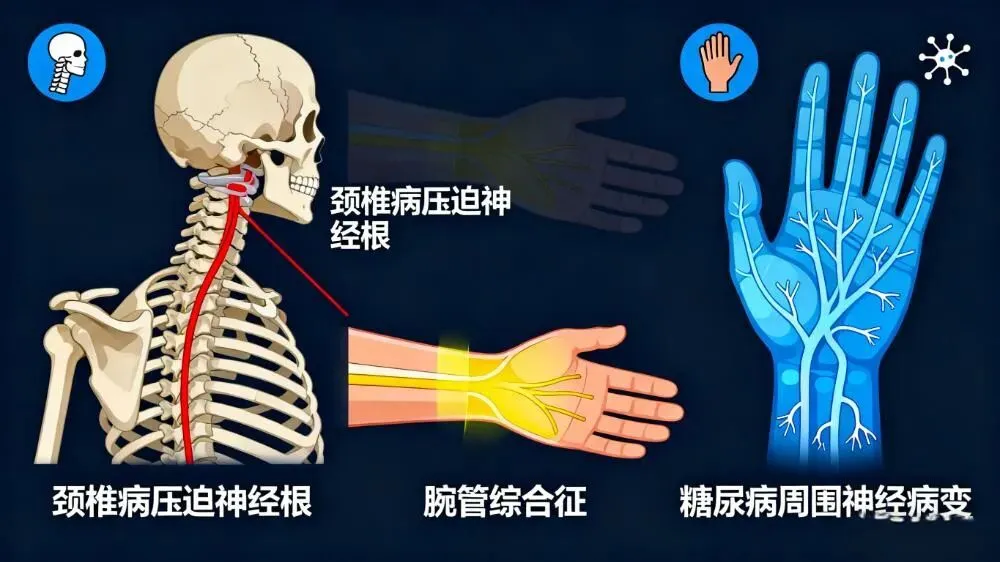 ③神经根性损伤: 如颈椎病、腰椎间盘突出症。表现为特定皮节/肌节的感觉、运动、反射异常,可能伴发自主神经症状。临床统计中,神经根性损伤约占周围性疼痛麻木病例的7%。