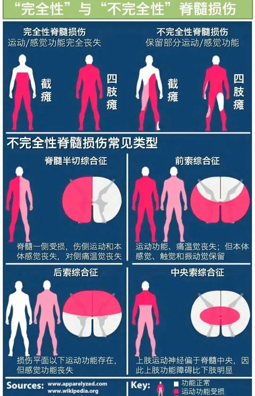 脊髓损伤的定位需结合纵向(损伤平面)和横向(损伤范围)两个维度。根据横断面损伤模式,可分为以下几种主要类型: