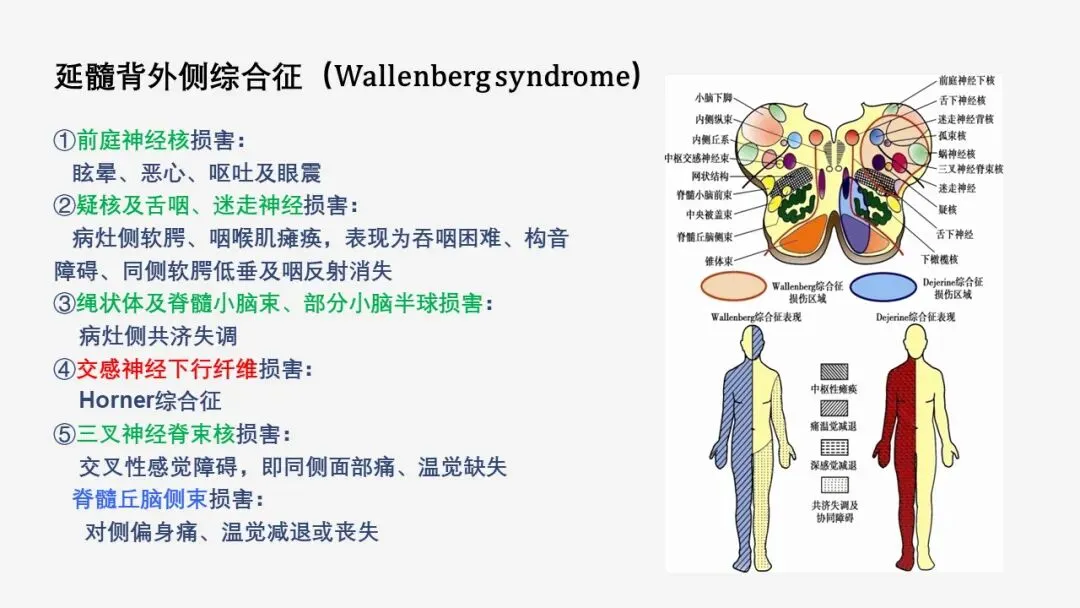 案例: 延髓出血患者,表现为同侧肢体本体感觉严重障碍(实体觉、定位觉丧失),并伴有构音障碍、吞咽困难(饮水呛咳)及共济失调。 5. 小脑损伤:主要导致平衡障碍、共济失调及协调性运动问题。 6. 间脑(丘脑)损伤:丘脑为感觉中继站,损伤常导致全局性、偏侧躯体感觉障碍。