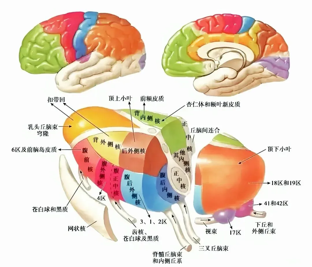 ④板内核/网状核:调节大脑皮质广泛兴奋性,与意识、觉醒、疼痛的情感成分及癫痫有关。