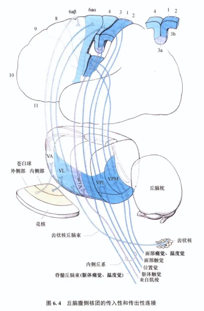 腹前核/腹外侧核: 接收基底节和小脑的传入,是运动调节通路的关键中继。功能障碍可导致帕金森症(运动过少)或舞蹈症/抽动症(运动过多)。 ⑷腹后外侧核: 接收躯干四肢的本体感觉(经内侧丘系)和痛温觉(经脊髓丘脑束)。