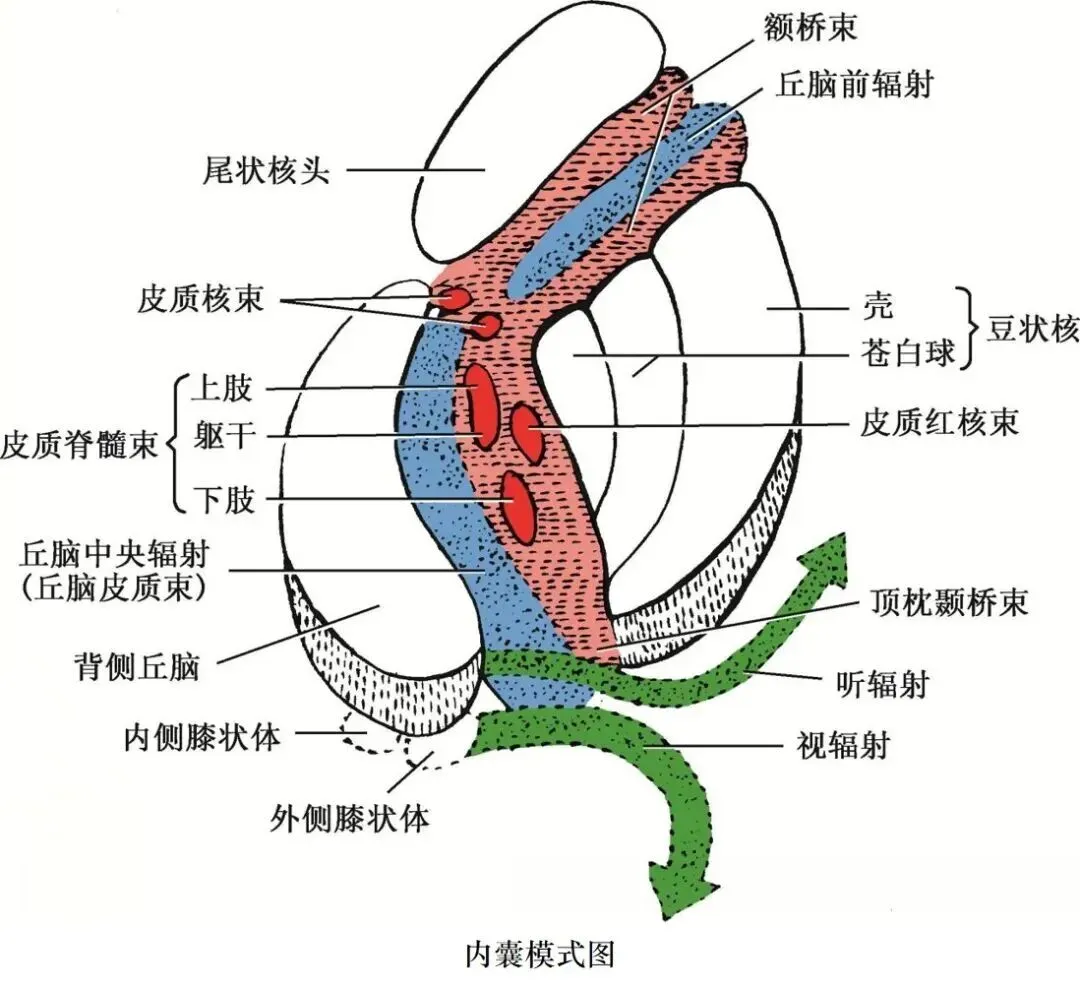 ③枕核: 感觉整合中枢,整合视觉、本体感觉等信息,损伤可导致视觉性注意力缺陷和忽略症。