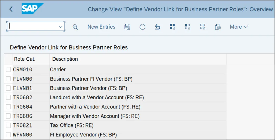上图展示了用于关联供应商和业务伙伴的业务伙伴角色类别。要列出为供应商主数据创建的新业务伙伴角色类别,以定义供应商与业务伙伴角色的关联,请点击“新条目”,并列出创建的相关供应商相关业务伙伴角色。系统会自动将此配置表中列出的业务伙伴角色与供应商关联起来。当你创建一个具有属于某个业务伙伴角色类别的业务伙伴角色的业务伙伴时,系统会创建一个供应商并将其与该业务伙伴关联起来。业务伙伴角色类别用于集成业务伙伴和客户。要启用从业务伙伴到客户的集成,执行事务代码 SPRO,然后导航至跨应用组件 • 主数据同步 • 客户/供应商集成 • 业务伙伴设置 • 客户集成设置 • 设置从业务伙伴到客户方向的业务伙伴角色类别。