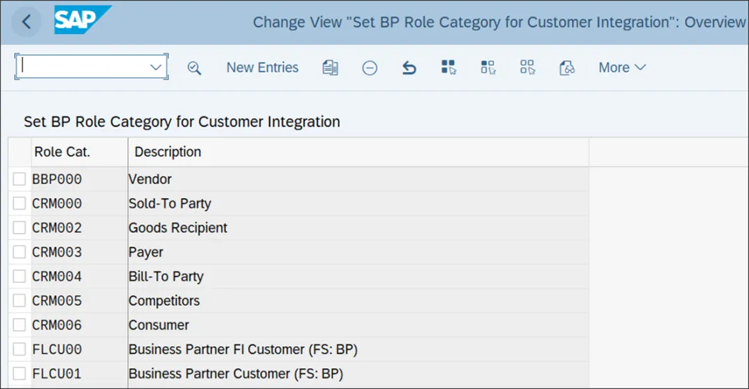 上图展示了用于关联客户和业务伙伴的业务伙伴角色类别。要列出为客户主数据创建的新业务伙伴角色类别,以定义客户与业务伙伴角色的关联,请点击“新条目”,并列出创建的相关客户相关业务伙伴角色。系统会自动将此配置表中列出的业务伙伴角色与客户关联起来。当你创建一个具有属于某个业务伙伴角色类别的业务伙伴角色的业务伙伴时,系统会创建一个客户并将其与该业务伙伴关联起来。你若喜欢,点个❤️谢先👇