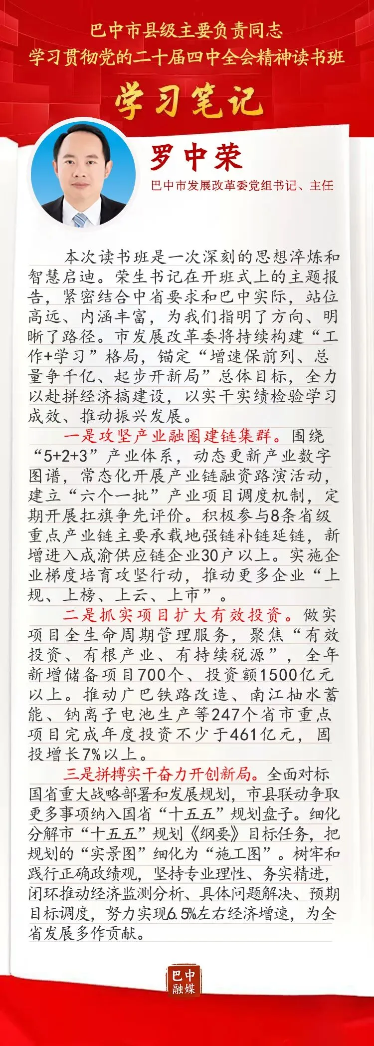 本次读书班是一次深刻的思想淬炼和智慧启迪。荣生书记在开班式上的主题报告,紧密结合中省要求和巴中实际,站位高远、内涵丰富,为我们指明了方向、明晰了路径。市发展改革委将持续构建“工作+学习”格局,锚定“增速保前列、总量争千亿、起步开新局”总体目标,全力以赴拼经济搞建设,以实干实绩检验学习成效、推动振兴发展。