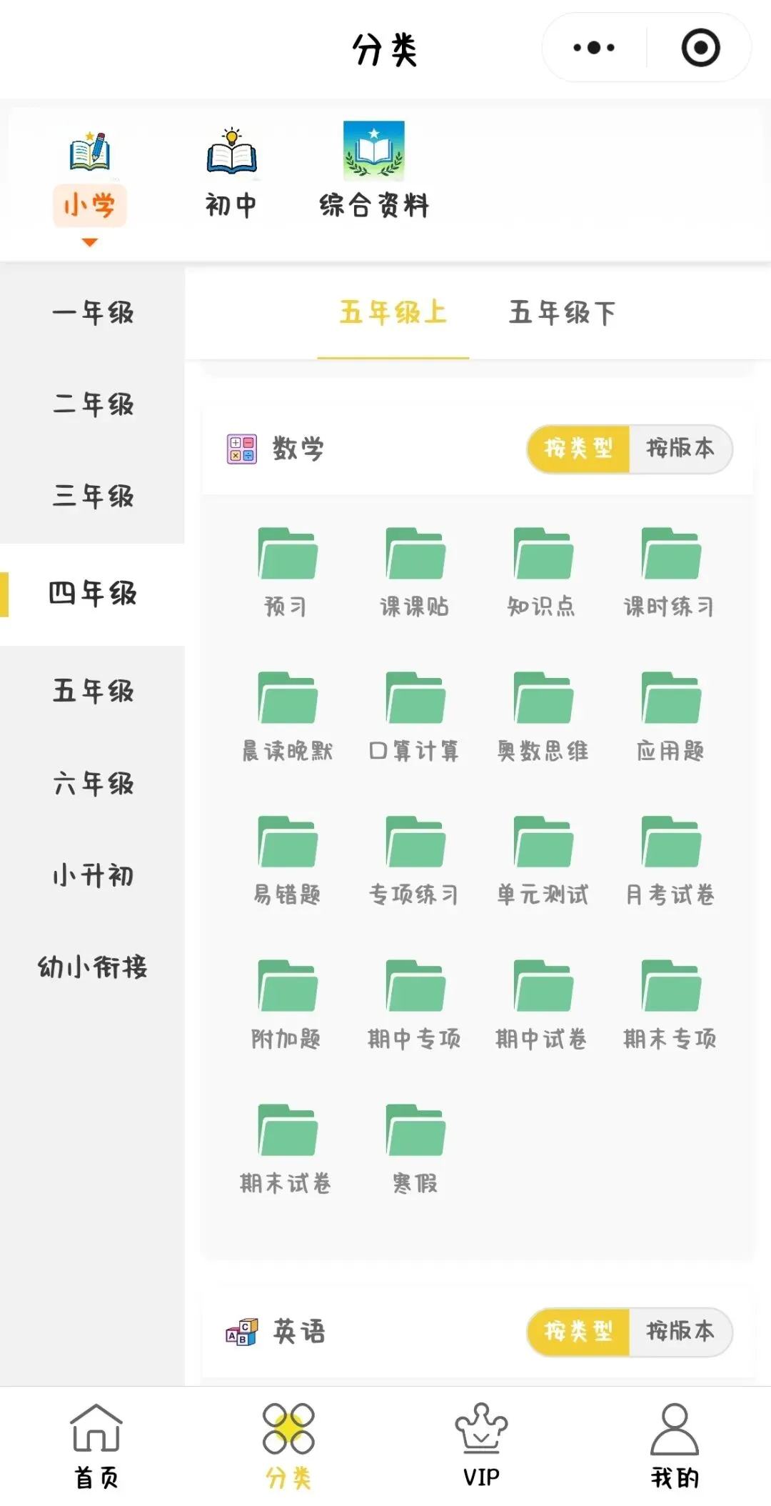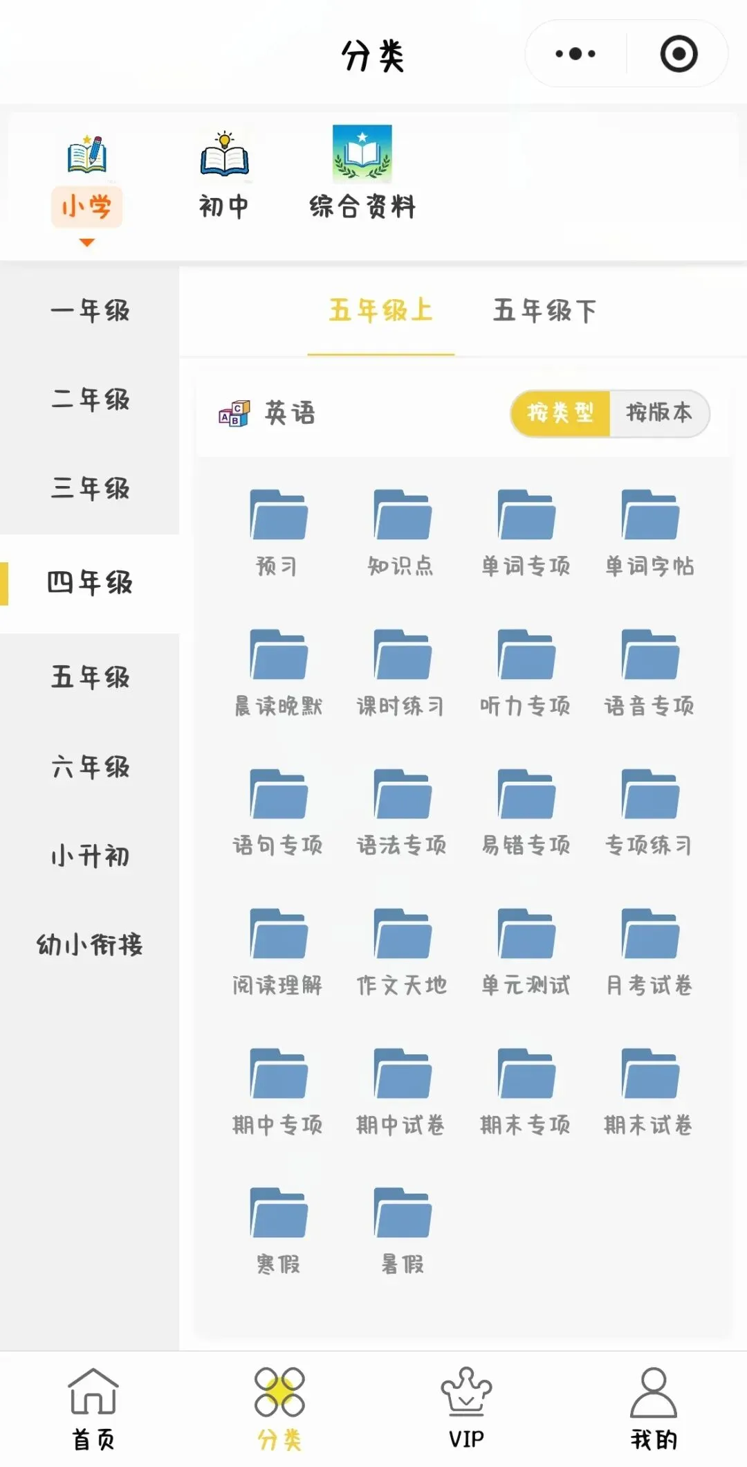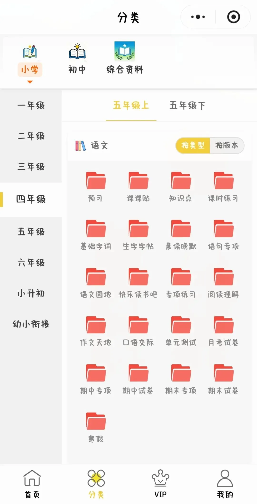 ★学习资料的类别涵盖:预习、课课贴、知识点、课时练习、基础读写、生字字帖、晨读晚默、语句专项、语文园地、专项练习、阅读理解、口语交际、作文天地、单元测试、月考试卷、期中专项、期中试卷、期末专项、期末试卷、寒假、暑假。