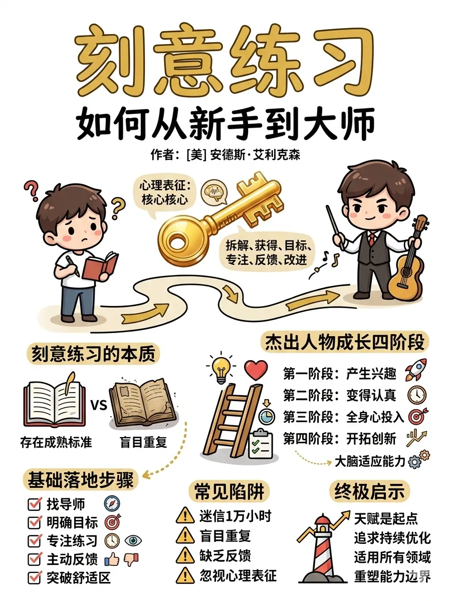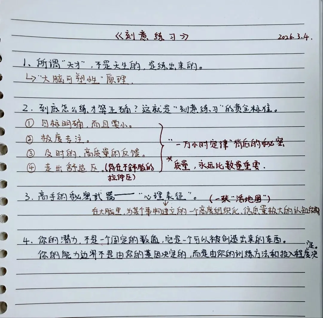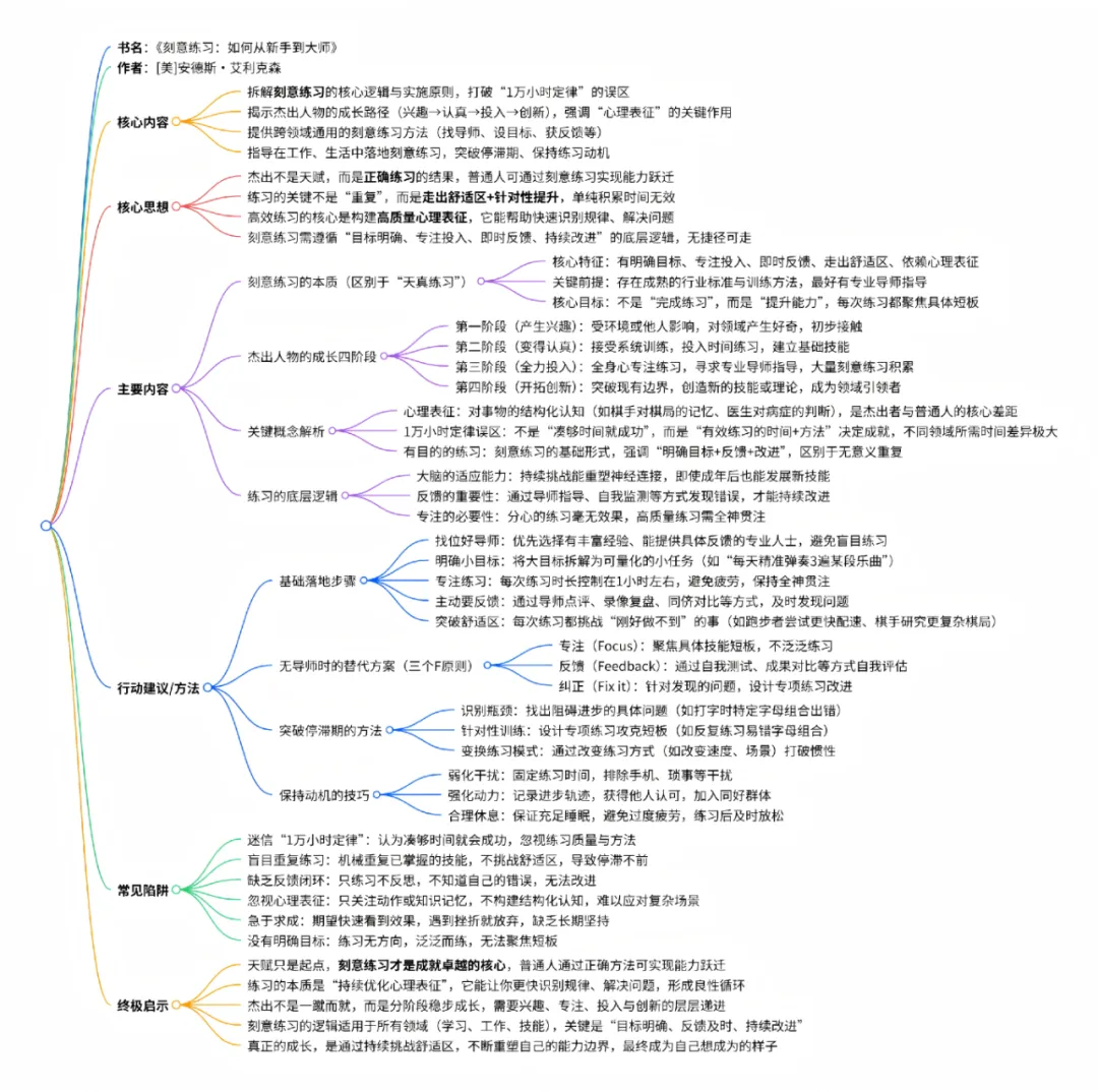 ● 书名:《刻意练习》● 作者:安德斯·艾利克森/罗伯特·普尔● 阅读理由:本书的核心观点是:人类的大脑和身体具有惊人的适应能力,所谓的天赋其实是利用这种适应能力进行长期训练的结果。书中内容概要笔记: