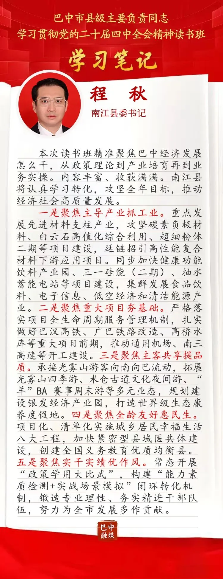 市委读书班学习笔记③ | 南江县委书记程秋:凝心聚力抓产业 干字当头拼经济