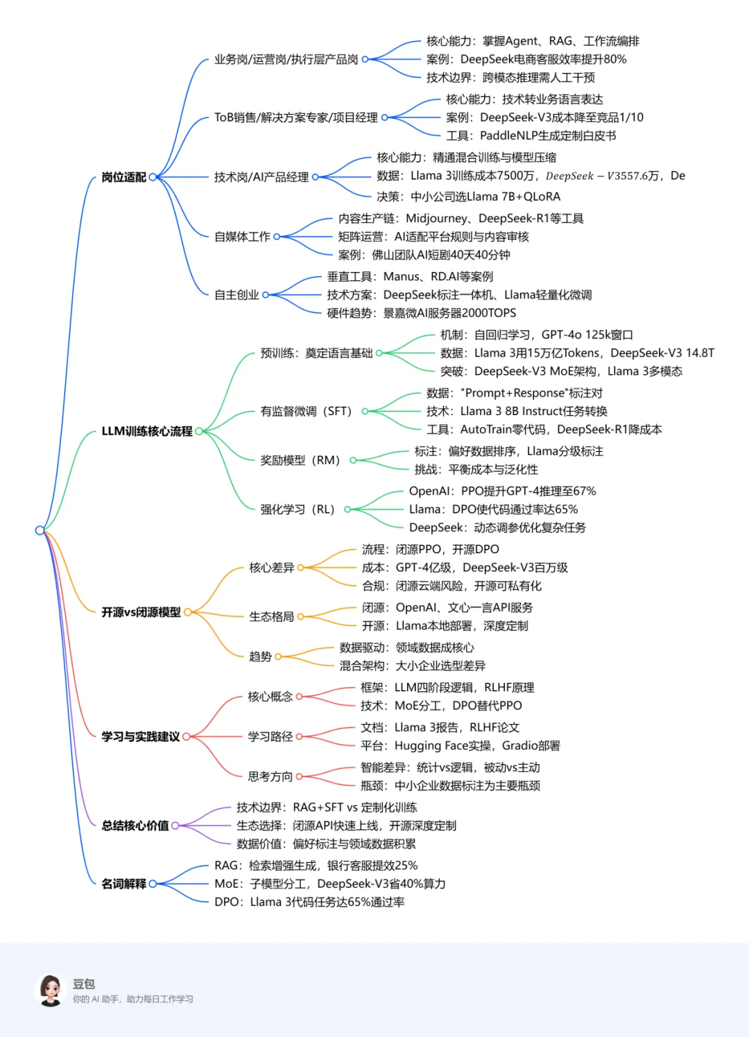 案例学习:掌握 “模型训练成本”相关数据(如 Llama 3 训练消耗 15 万亿 Tokens,GPT-4 单次训练成本超 1 亿美元),能对比不同模型的性价比(如 Llama 适合中小公司,GPT 适合快速验证场景);掌握 "DeepSeek-V3 训练成本仅为 Llama 3 的 1/10" 等数据,说明技术选型优势。搜寻学习案例展示技术落地能力,强调 “数据标注格式”(如问答 vs 纯文本)对模型效果的影响。