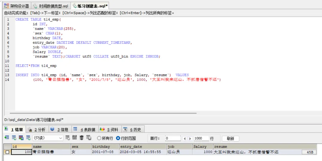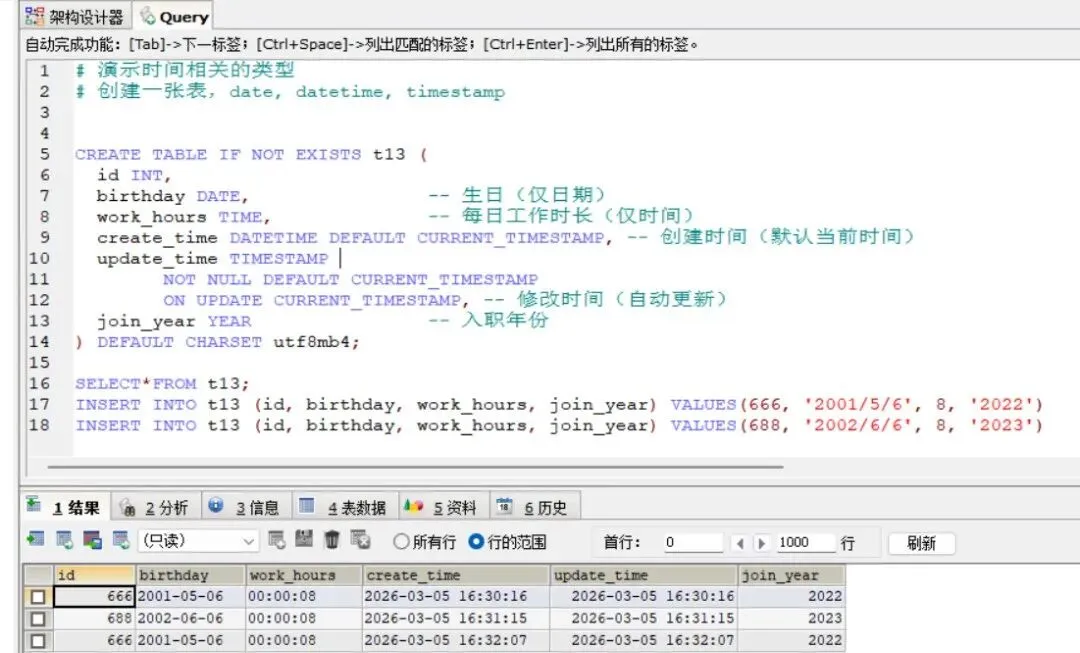内容小结:这篇学习了时间数据类型,要注意区分datetime与时间戳timestamp,后者具有自动更新特征,同时也第一次了解到主键,修改表的结构是重点内容,其中包含了很多语句内容,需要及时复习。最后要注意在终端操作时一定不能遗漏;分号代码使用:创建表中时间数据类型语句、设置主键语句、修改表结构的Alter系列语句上面用表格形式整理总结了时间数据类型的分类和各自的特点,下面是语句的具体实现:CREATE TABLE IF NOT EXISTS t13 ( id INT PRIMARY KEY AUTO_INCREMENT, birthday DATE, -- 生日(仅日期) work_hours TIME, -- 每日工作时长(仅时间) create_time DATETIME DEFAULT CURRENT_TIMESTAMP, -- 创建时间(默认当前时间) update_time TIMESTAMP ON UPDATE CURRENT_TIMESTAMP, -- 修改时间(自动更新) join_year YEAR -- 入职年份) DEFAULT CHARSET utf8mb4;
