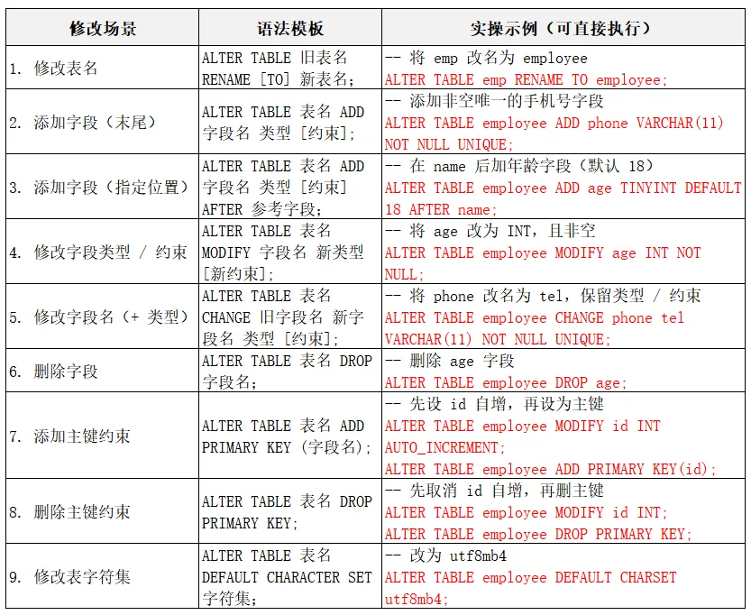 -- 修改job列,使其长度为60ALTER TABLE t14_emp MODIFY job VARCHAR(60) NOT NULL DEFAULT ''-- 删除sex列ALTER TABLE t14_empDROP sex-- 表名改为employeeRENAME TABLE t14_emp TO t14_employeeSELECT*FROM t14_employee