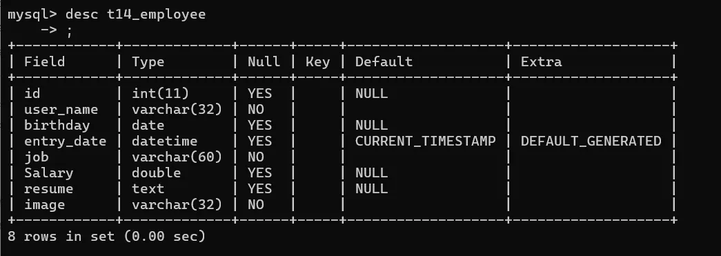-- 修改表的字符集为utf8ALTER TABLE t14_employee CHARSET utf8DROP sex-- 列名name修改为user_nameALTER TABLE t14_employee CHANGE `name` `user_name` VARCHAR(32) NOT NULL DEFAULT ''DESC t14_employee