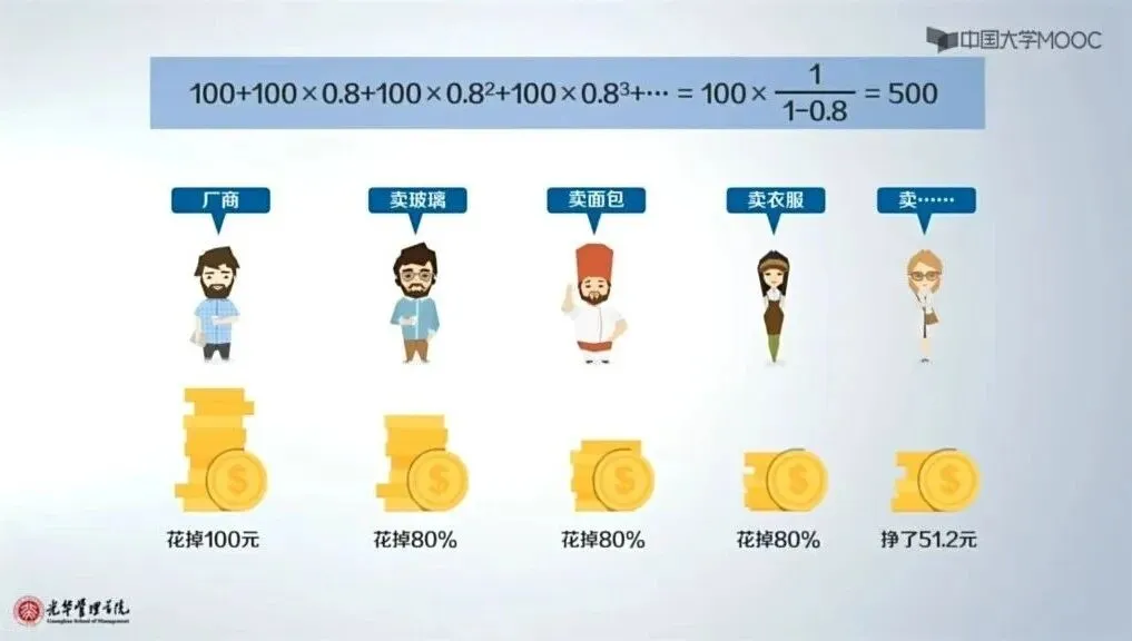 如果工厂换一块玻璃要花100元,玻璃商厂花80块钱买面包,面包商家花64元买衣服,等等,按照这个过程进行计算下去。(注意到了吗,这个过程中我假设人们会把赚到的20%的钱存起来)