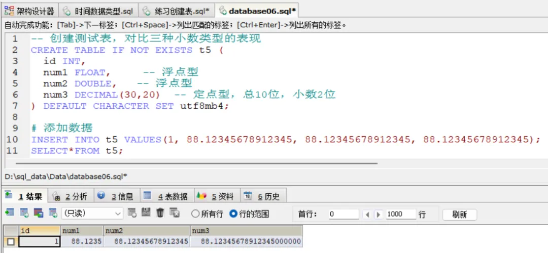 上面的三种浮点型数据中,数值精度是不一样的,float 的精度最差,我们通过insert into语句,存储具有多位小数的数值,在查询时,可能会出现精度丢失的情况。如下面例子所示:-- 创建测试表,对比三种小数类型的表现CREATE TABLE IF NOT EXISTS t5 ( id INT, num1 FLOAT, -- 浮点型, num2 DOUBLE, -- 浮点型, num3 DECIMAL(10,2) -- 定点型,总10位,小数2位) DEFAULT CHARACTER SET utf8mb4;# 添加数据INSERT INTO t5 VALUES(1, 88.12345678912345, 88.12345678912345, 88.12345678912345)SELECT*FROM t5