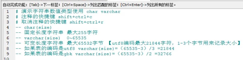 | | 无需指定长度,最大存储 65535 字符,适合长文本(如备注、简介) |