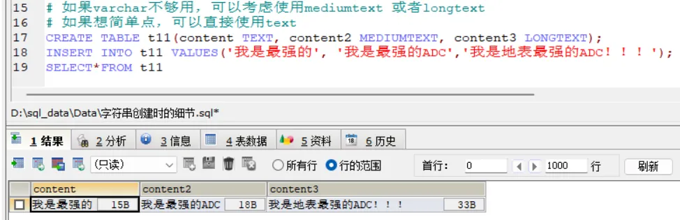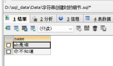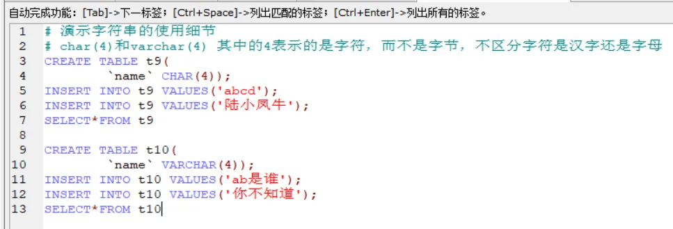 上面是创建表的过程,这个很好理解,创建的时候,你就要确定表头中都要有哪些信息要存储,所以要确定一下表头信息。CREATE TABLE t9( `name` CHAR(4));INSERT INTO t9 VALUES('abcd');INSERT INTO t9 VALUES('陆小凤牛');SELECT*FROM t9CREATE TABLE t10( `name` VARCHAR(4));INSERT INTO t10 VALUES('ab是谁');INSERT INTO t10 VALUES('你不知道');SELECT*FROM t10