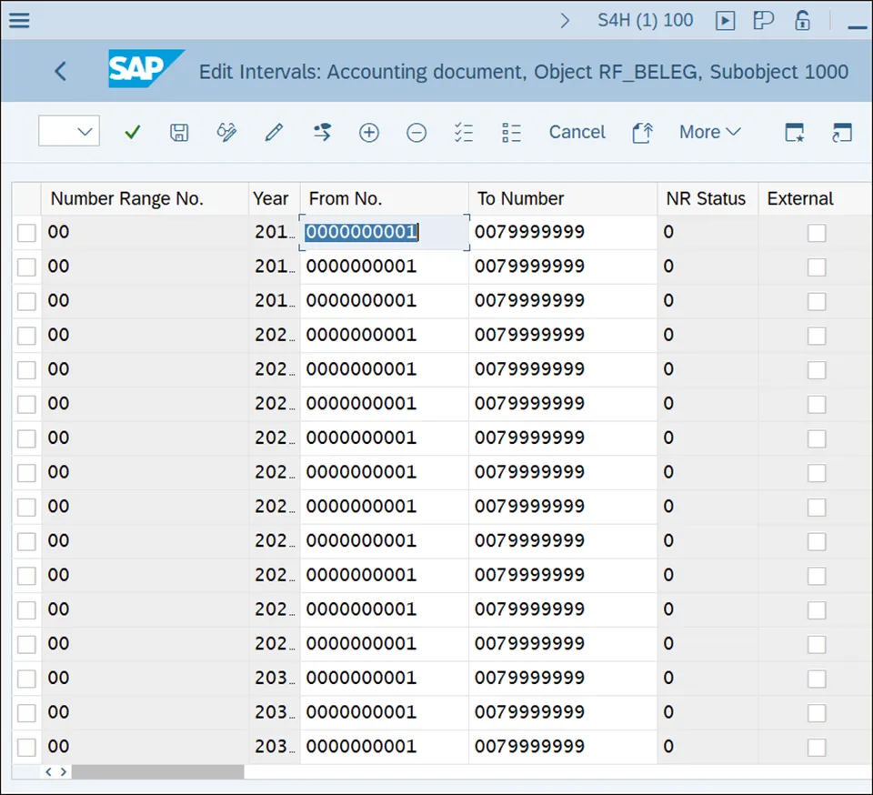编号范围在整个系统中用于为各种交易和主数据对象分配编号。因此,SAP 中的每个凭证类型都必须分配一个编号范围,该范围将控制所分配的凭证编号,并控制这些编号是由系统内部生成,还是必须由外部输入。要配置编号范围,请按照以下菜单路径操作:财务会计 • 财务会计全局设置 • 凭证 • 凭证编号范围 • 定义凭证编号范围。在“公司代码”字段中输入“1000”,然后点击按钮修改该公司代码的编号范围,如下图所示。在创建新的公司代码 1000 时,其编号范围会随其他参数一同复制过来。这些范围如下图所示。每个区间在最左侧列中以其编号(01、02、03 等)标识,该编号就是要分配给凭证类型的编号。接着,会看到有效期年份;一个好的做法是将此值设置为“9999”,这意味着没有限制。接下来,在“起始编号”和“结束编号”字段中输入值来定义区间,系统将在该区间内连续分配凭证编号(如果编号是由系统内部分配)。在“编号状态”列中,可以看到当前编号(在没有数据的开发系统中为 0)。在最后一列“外部”中,打勾表示在录入凭证时,该区间内的编号必须由用户手动输入。对编号范围的更改不会自动传输,因为这样做可能会导致目标客户端出现不一致的情况。一个好的做法是在每个客户端手动设置编号范围,这应该是生产启动期间切换活动的一部分。你若喜欢,点个❤️谢先👇