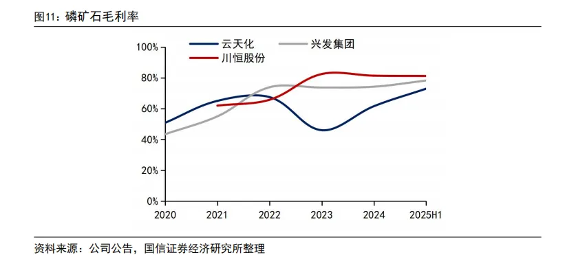 磷矿石毛利率保持较高水平。川恒股份的磷矿石毛利率在 2023 年超过 80%并维持高位,其在磷矿资源布局、成本控制或产品结构上有较强优势;兴发集团毛利率稳步提升。2025 年上半年,川恒股份、兴发集团、云天化的磷矿石毛利率均处于80%左右的高毛利水平。具备自有矿山、高品位磷矿储备及产业链协同的企业盈利能力更强,磷矿石业务为头部磷化工企业的重要利润支撑点。需求端: